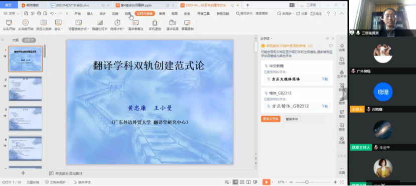 2020年4月25日,由广东外语外贸大学中国译学协同研究中心主办,高级翻译学院翻译理论创新研究中心承办,广外伟德国际victor1946心、国家级同声传译实验教学中心和广东省外语研究与语言服务协同创新中心协办的“第四届理论翻译学及译学方法论”高层论坛在腾讯会议室举行,通过“译直播”和“bilibili”等网络平台面向全国同步分享。论坛围绕“学科体系化”、“翻译研究学科化”、“学科研究方法论”以及“译学研究批判与反思”等议题进行了探讨,吸引了国内外数千名专家学者和硕博士研究生关注和参与,B站直播人气达到1.1万人,“译直播”总阅读量达4931人。本次论坛采用现代信息技术手段,是一场受众颇为广泛的高水平学术盛宴。