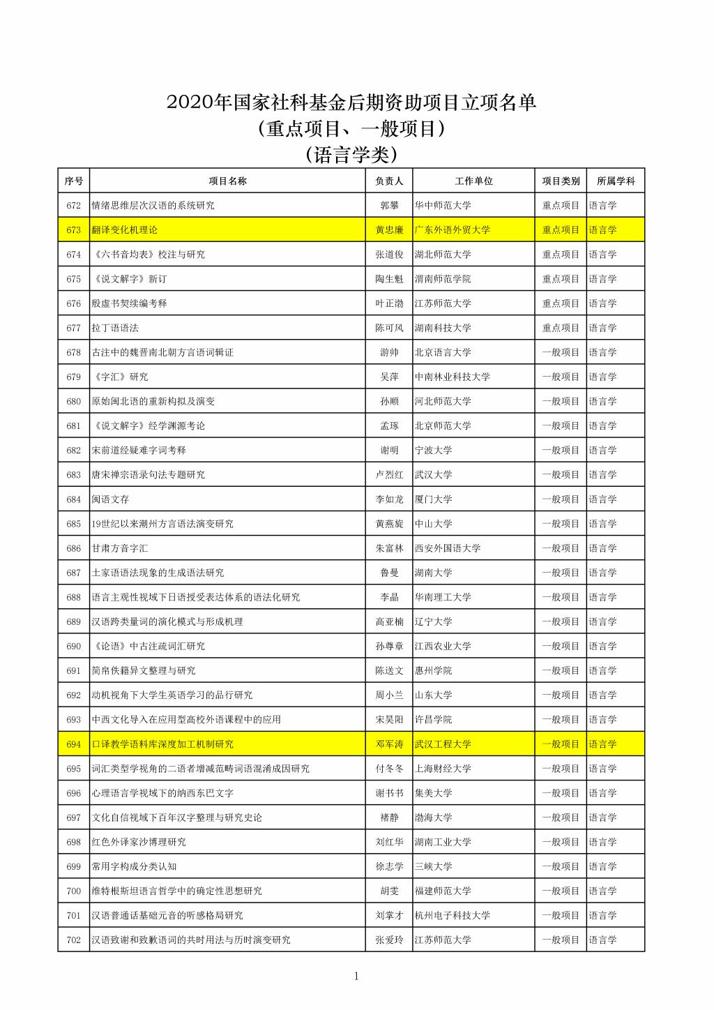 9月29日,2020年国家社科基金后期资助暨优秀博士论文出版项目立项名单在全国哲学社会科学工作办公室网站公示。伟德国际victor1946专职研究员黄忠廉教授申报的“翻译变化机理论”获语言学类重点项目拟立项,中心博士后邓军涛老师申报的“口译教学语料库深度加工机制研究”获语言学类一般项目拟立项。
