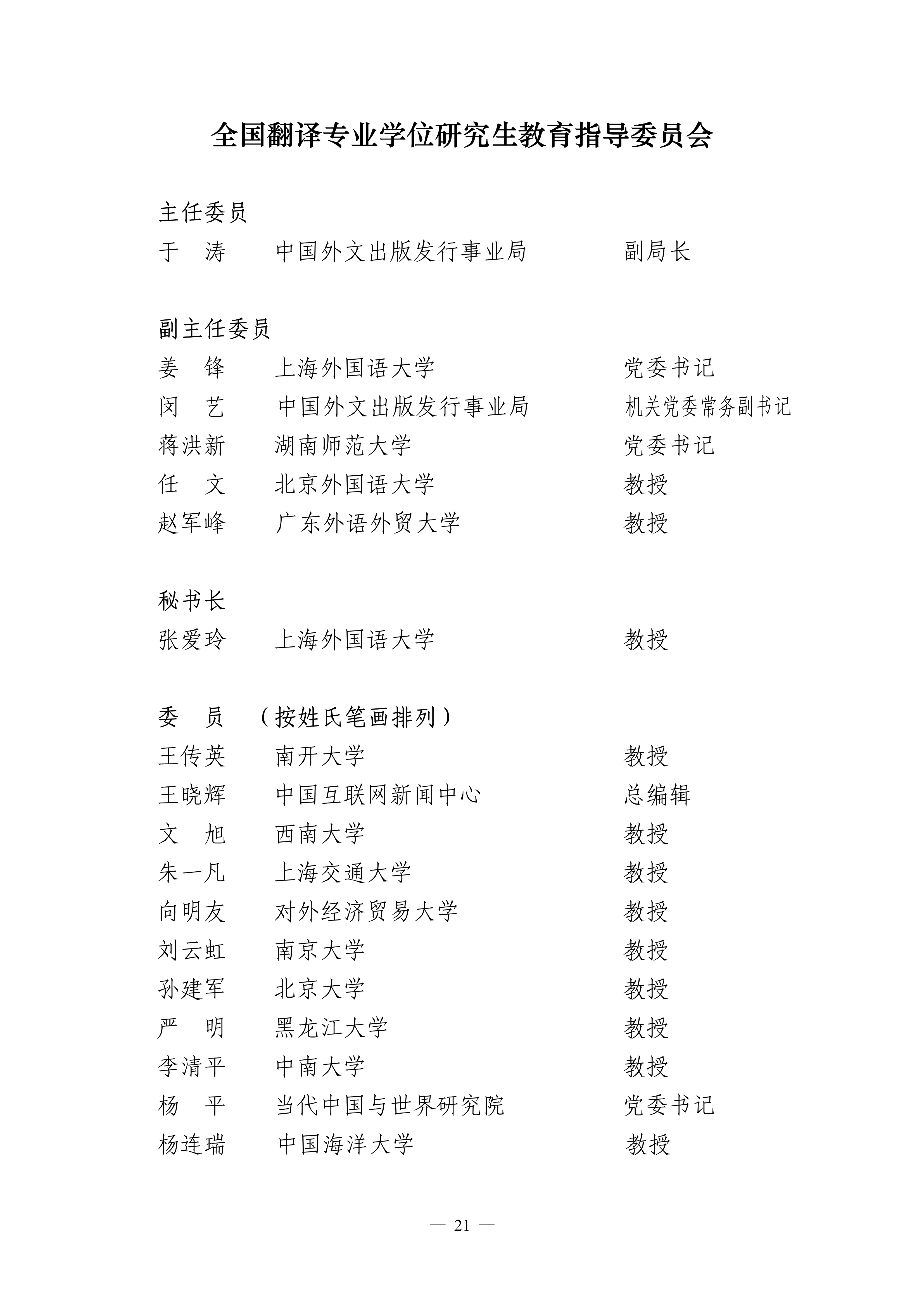 本届翻译教指委由29名成员组成,其中主任委员1名,副主任委员5名,秘书长1名,委员22名,中国外文局副局长于涛担任主任委员,上海外国语大学党委书记姜锋、中国外文局翻译资格考试办公室主任闵艺、湖南师范大学党委书记蒋洪新、北京外国语大学教授任文、广东外语外贸大学教授赵军峰担任副主任委员;上海外国语大学教授张爱玲担任秘书长;南开大学教授王传英等22人担任委员。