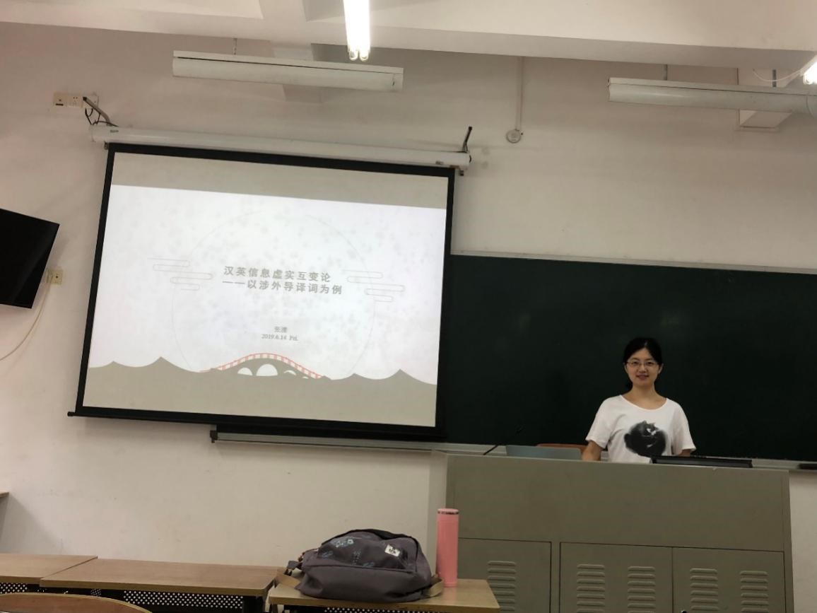 由翻译学研究中心主办的第59期“翻译学博士生论坛”于2019年6月15日14:00—16:00在六教B206举行,本次论坛的主题为:汉英信息虚实互变论——以涉外导译词为例。本次论坛由18级翻译学博士生张潇主讲,伟德国际victor1946心专职研究员曾利沙教授应邀出席。论坛参与人还包括高翻学院、英文学院、商英学院博士生等。