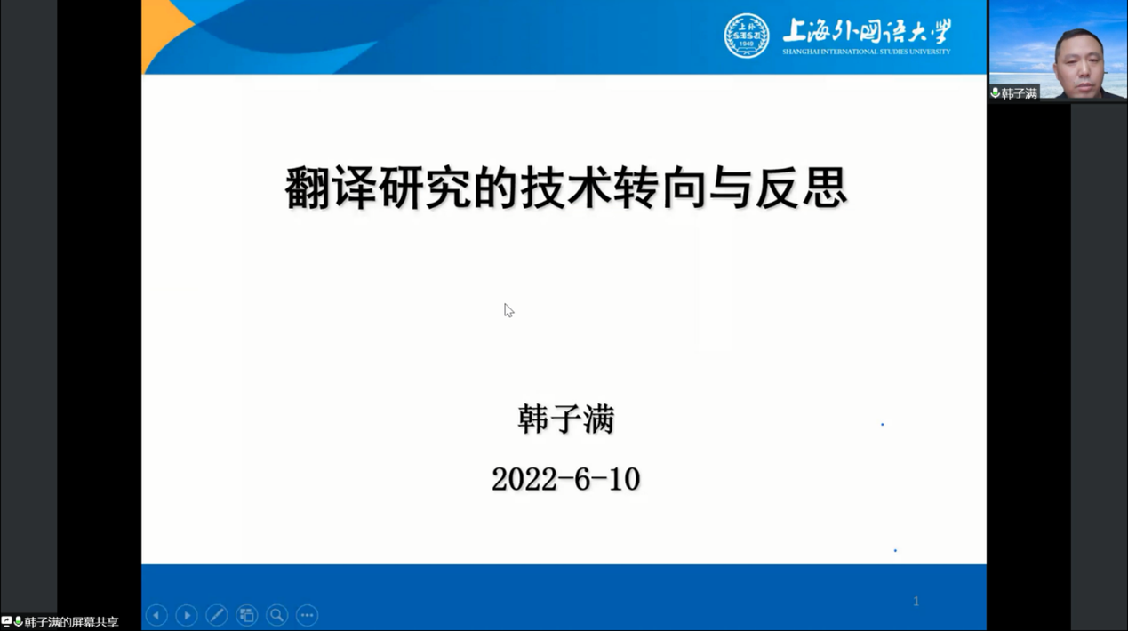 2022年6月10日下午,由广外人事处、教师发展中心主办,伟德国际victor1946心承办的“著名教授论坛”第561讲暨翻译学硕士研究生论坛于线上举行。本次讲座邀请上海外国语大学语料库研究院教授、博士生导师韩子满教授主讲,伟德国际victor1946心主任赵军峰教授主持,通过腾讯会议平台向校内外师生线上直播。